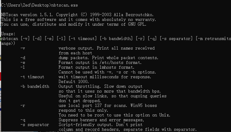 这是一款用于扫描WINDOWS网络上NETBIOS名字信息的程序。该程序对给出范围内的每一个地址发送NETBIOS状态查询,并且以易读的表格列出接收到的信息,对于每个响应的主机,NBTSCAN列出它的IP地址、NETBIOS计算机名、登录用户名和MAC地址。但只能用于局域网,NBTSCAN可以取到PC的真实IP地址和MAC地址,如果有”ARP攻击”在做怪,可以找到装有ARP攻击的PC的IP/和MAC地址。但只能用于局域网,NBTSCAN可以取到PC的真实IP地址和MAC地址,如果有”ARP攻击”在做怪,可以找到装有ARP攻击的PC的IP/和MAC地址。NBTSCAN可以取到PC的真实IP地址和MAC地址,如果有”ARP攻击”在做怪,可以找到装有ARP攻击的PC的IP/和MAC地址。总之,NBTSCAN可以取到PC的真实IP地址和MAC地址。