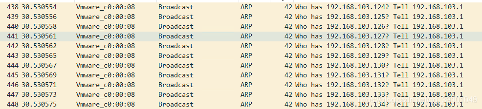 在wireshark中可看到,该工具首先使用arp协议广播整个网段