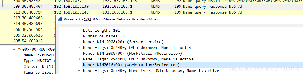 获取到mac地址和 ip地址后,利用NetBios协议发送NBNS query包查询139和145主机的主机名(NetBIOS name 报文)